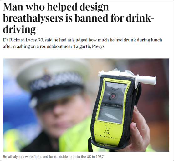 据英国《泰晤士报》19日报道,参与研发酒精测试仪的科学家理查德·莱西,于日前被测出酒驾被英国警方吊销驾照。